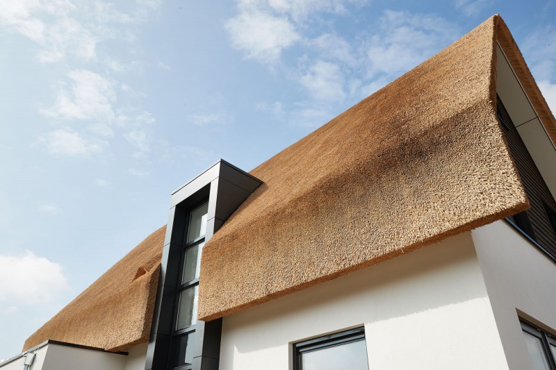 Houtskeletbouw-woning met een rieten dak