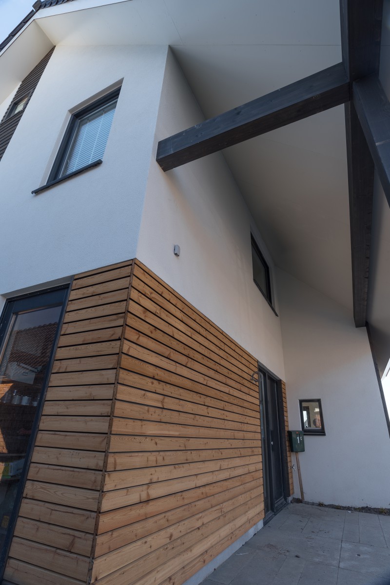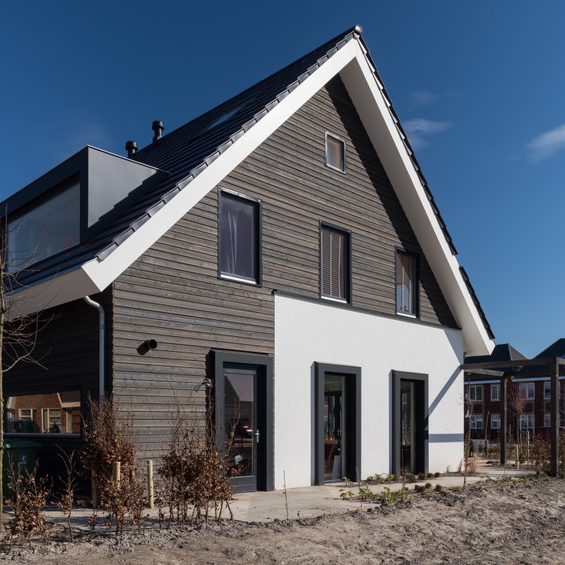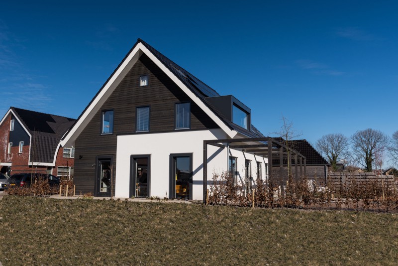 Deze houtskeletbouwwoning is voorzien van mooie details aan de buitenkant. Aan de buitenkant is gekozen voor hout en stucwerk. Dit zorgt voor een frisse aanblik. Met de kozijnen is ook wat bijzonders gedaan, ze zijn wat meer naar buiten gebracht, dit zorgt voor een ruimtelijk aanzicht.