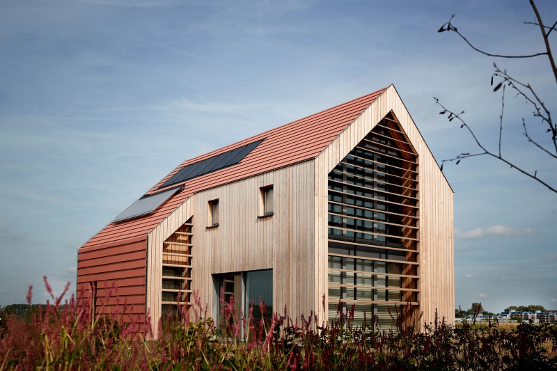 Bij het ontwerp van deze woning is werkelijk aan alles gedacht. De woning is helemaal integraal berekend, bij het bouwen van een passief woning zorgen alle factoren samen voor het meest optimale resultaat. Er moet niet alleen gedacht worden aan het soort materiaal en de type installatie, juist ook de situering van de woning op de kavel speelt een belangrijke rol. Je moet namelijk optimaal gebruik maken van de zon, daarom is er ook gekozen voor grote ramen wat zorgt voor veel licht. Aan de buitenkant van de ramen zijn grote houten lamellen gehangen. In de zomer schijnt de zon op de lamellen en hou je de warmte uit het huis. In de winter schijnt de zon onder de lamellen en krijg komt juist het zonlicht en de warmte binnen.
